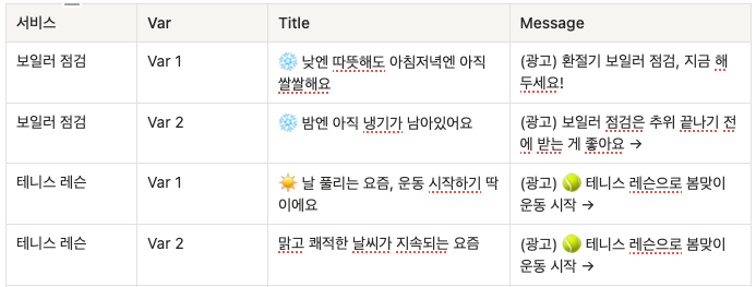 발송할 서비스가 결정되면, 각 서비스마다 사전에 준비한 Variation 1 / Variation 2 두 가지 메시지 카피를 랜덤으로 선택해 발송합니다. 날씨 감도를 강조하는 카피와 행동을 유도하는 카피 중 어떤 방식이 더 좋은 반응을 이끄는지를 동시에 검증합니다.