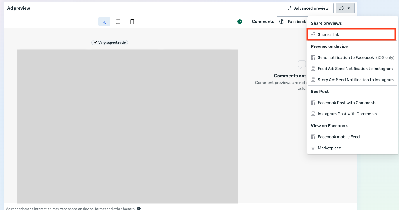 해당 캠페인(또는 광고 세트/광고)의 '링크 공유' 기능을 사용하여 테스트용 링크를 확보합니다.