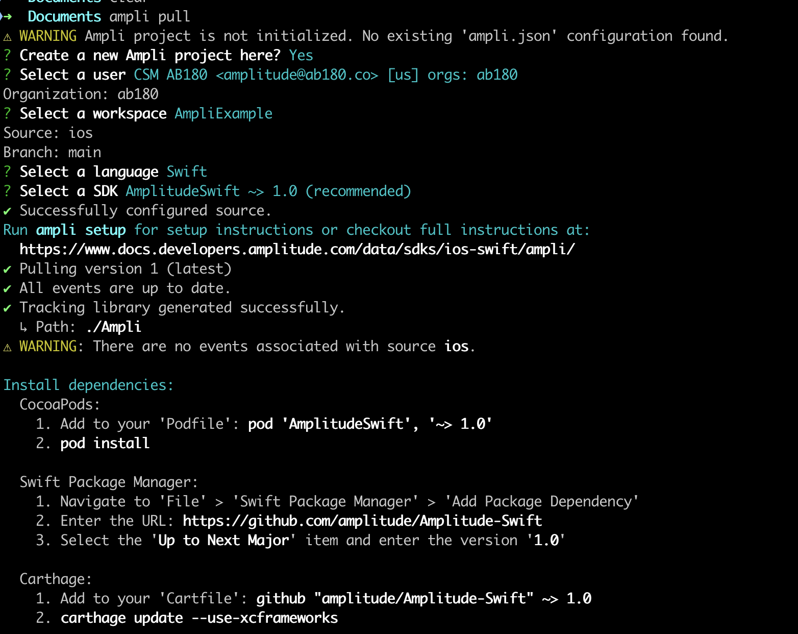 ampli pull을 실행합니다.User 선택 → Workspace 선택 → SDK 설치하라는 문구가 나오면 완료